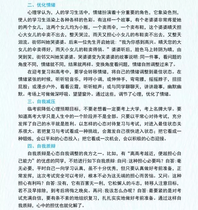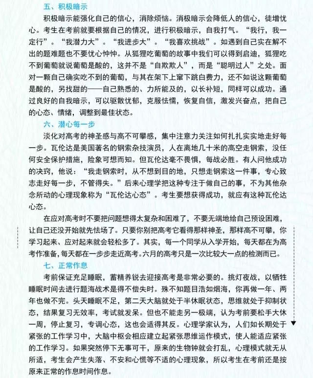 一般來(lái)說(shuō),人在自己熟悉的環(huán)境中比較容易放松。所以在進(jìn)入考場(chǎng)后、尚未發(fā)試卷前,考生******先熟悉一下考場(chǎng)環(huán)境,比如考場(chǎng)教室前后布置、自己所在的位置、周?chē)忌闆r、監(jiān)考老師模樣等。另外,在考卷發(fā)下來(lái)后,考生******先翻閱試卷,翻閱時(shí)要著眼于大致了解試題題型,不要過(guò)多地注意具體某幾道或者某一道考題的內(nèi)容。