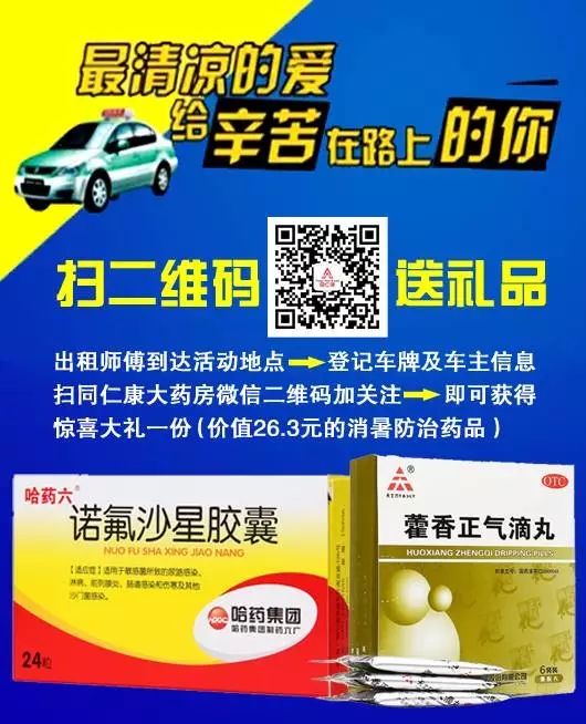 山西同仁康大藥房太原市與孝義市各藥房在7月7日--9日為“的哥、的姐”送上我們***真摯的祝愿,我們?yōu)槟呐谥屏讼顩霾韫┠赓M(fèi)飲用。并且現(xiàn)場(chǎng)掃碼即可獲贈(zèng)價(jià)值26.3元的消暑防治藥品(天士力集團(tuán)的藿香正氣滴丸和哈藥集團(tuán)的諾氟沙星膠囊),同時(shí)現(xiàn)場(chǎng)還免費(fèi)贈(zèng)送您價(jià)值5元的優(yōu)惠券四張,持此券您可在山西同仁康各藥房特惠購(gòu)藥。